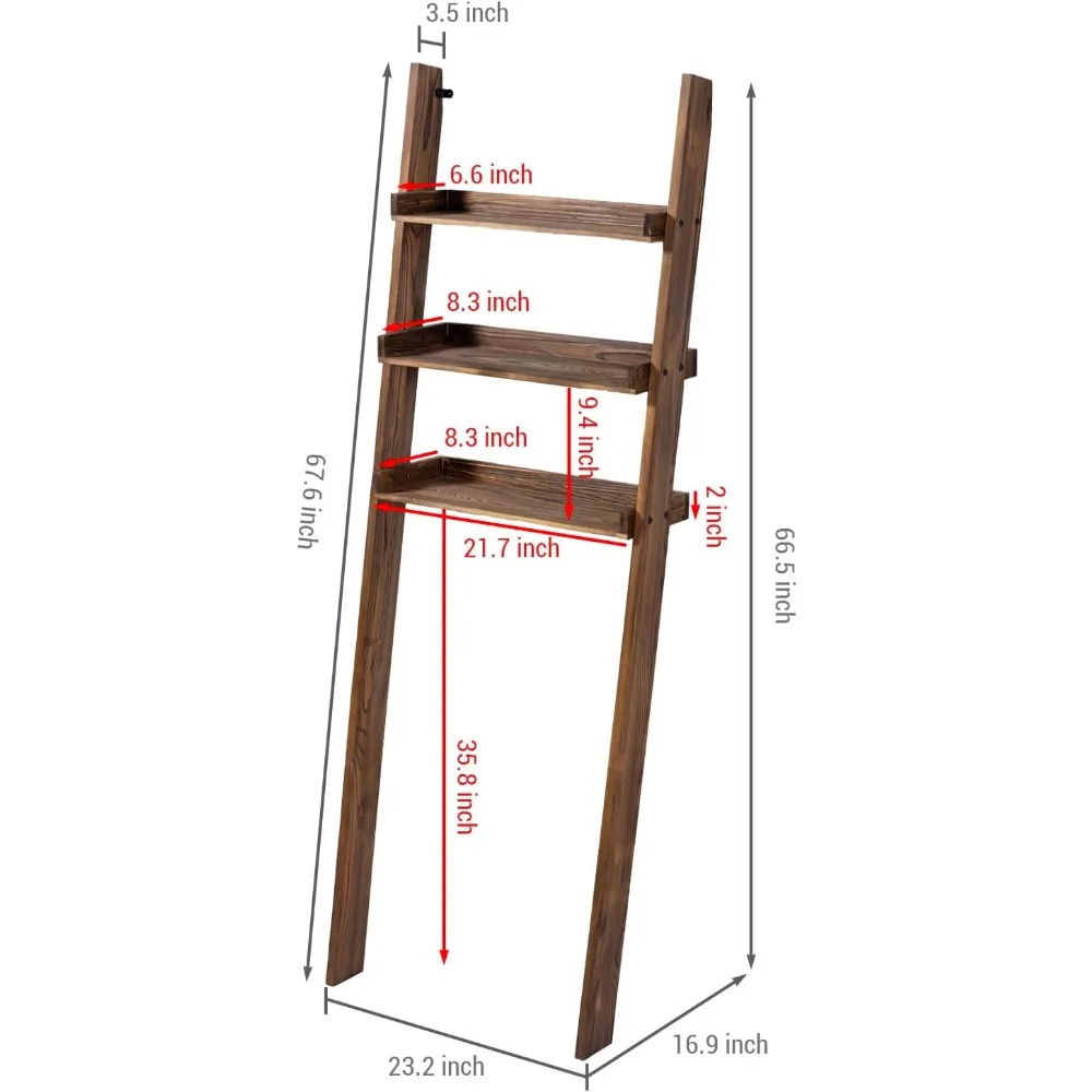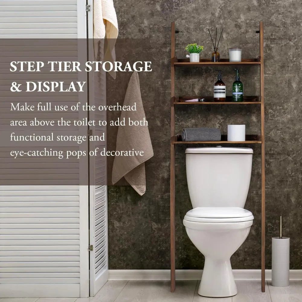 This three-tiered wooden over-the-toilet storage stand is designed for efficient space-saving bathroom organization. It features a modern rustic aesthetic with a burnt dark brown finish, crafted from solid wood to complement various decor styles. Each of the three shelves measures 7.5 by 20 inches, providing ample storage for small towels, toiletries, and bathroom essentials, helping to keep your space tidy and clutter-free. The 5.5-foot tall standing shelf utilizes vertical space effectively and is easy to assemble. It comes with two top metal wall brackets for secure placement, bottom foot pads, and standard mounting hardware. The approximate dimensions are as follows: Overall - 23.2 inches long x 16.9 inches wide x 66.5 inches high; Each Shelf - 20.5 inches long x 7.8 inches wide x 1.5 inches high; Space Between Shelves - 7.5 inches; Floor to Bottom Shelf - 31.0 inches. Some assembly is required.