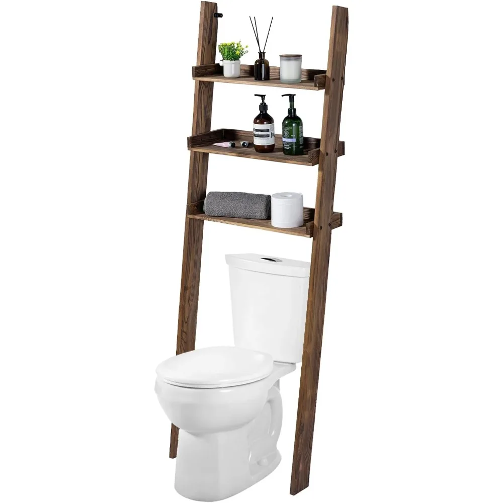 5.5 Foot Tall Rustic Burnt Wood Over Toilet 3-Tier Standing Shelf Bathroom Organizer