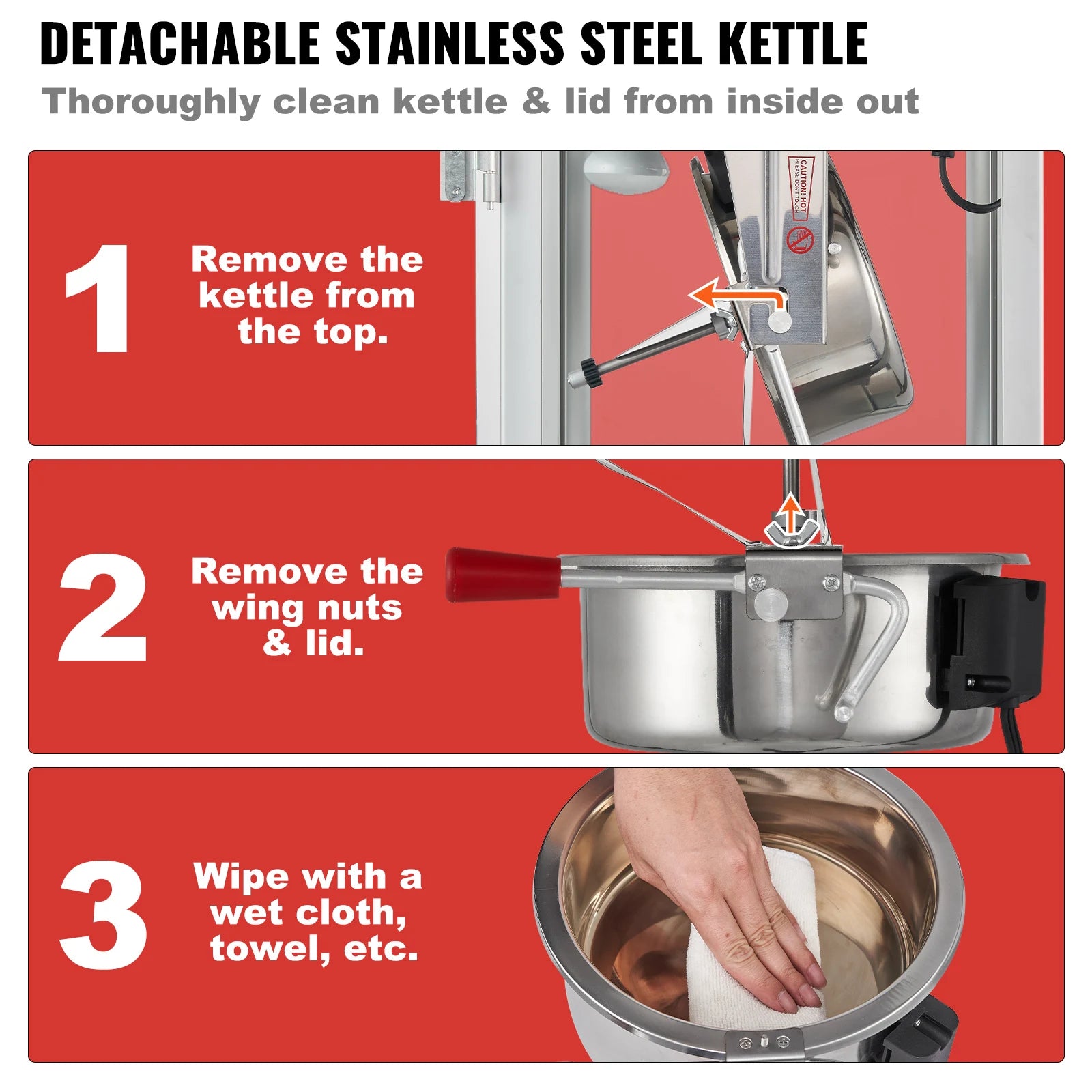 - Durable Structure, Easy to Clean: Constructed with a sturdy cold-rolled plate frame and tempered glass panels, this popcorn machine is built for heavy-duty use. The machine features a magnetic latch door for easy access and a visually appealing design, while the kettle lid is easily removed for quick cleaning with a wing nut. Regular cleaning will help prolong the machine's life and maintain its pristine appearance.
