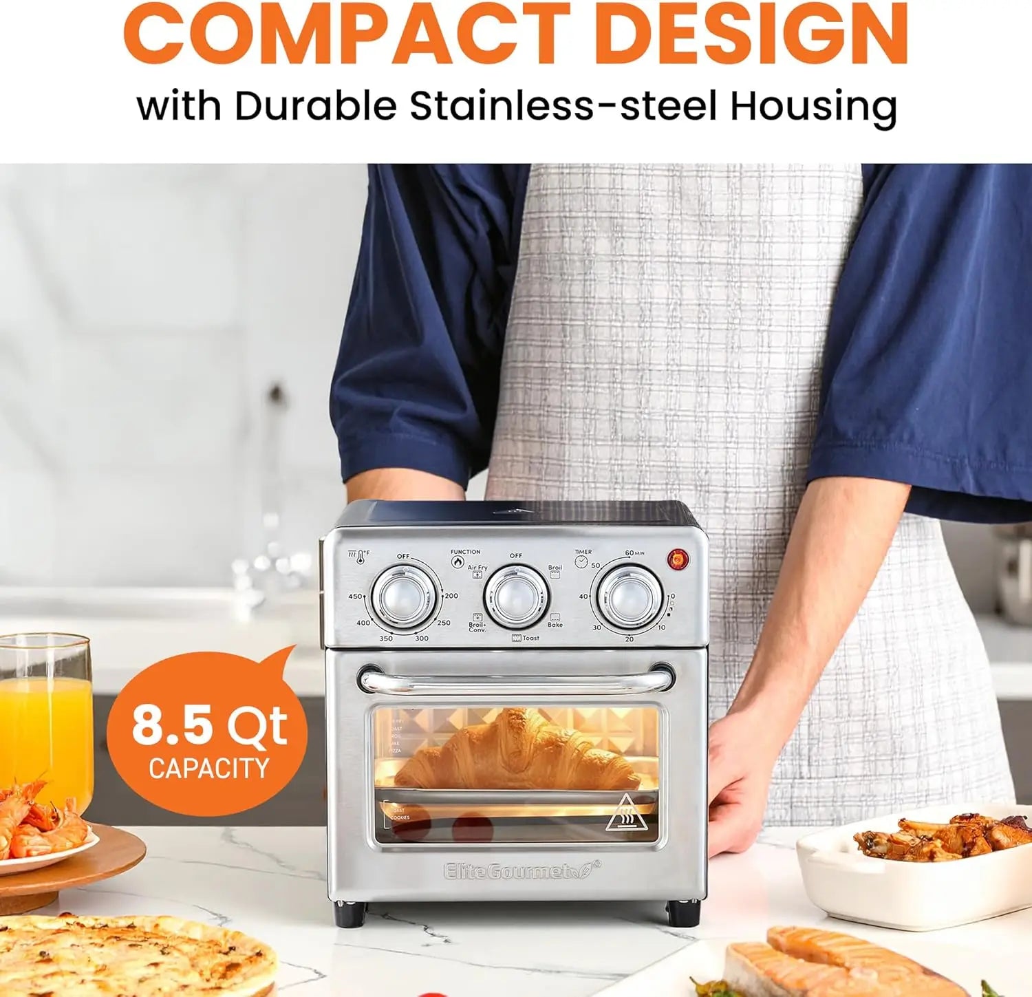 VERATILE 5-in-1 FUNTIONALITY: Choose from Air Fry, Broil, Toast, Bake, or Broil with Convection for ultimate cooking flexibility. Adjustable temperature settings (200°–450°F) with high power convection fan and a 60-minute timer ensure precise cooking, with an auto shut-off feature for added safety.