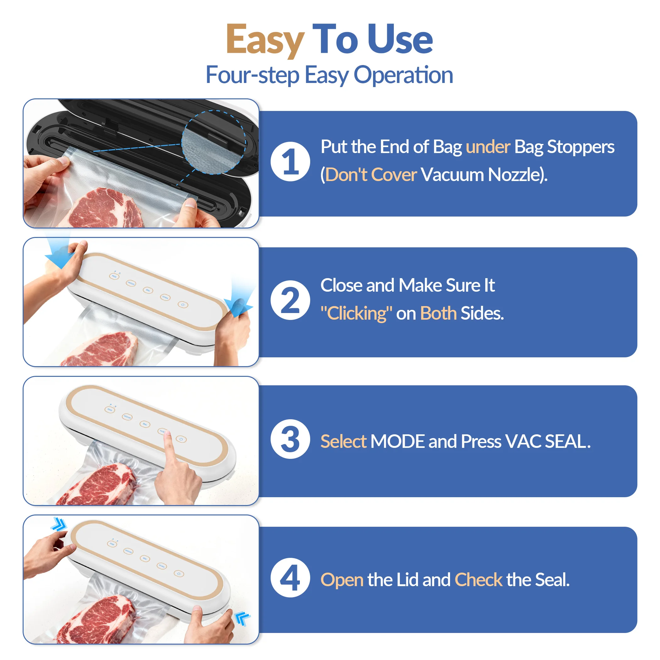 ✅【Handle Any Food with 4 Modes】Seal dry meats/nuts, wet soups/sauces, or delicate bread/berries without crushing; even reseal chip bags for later snacking.