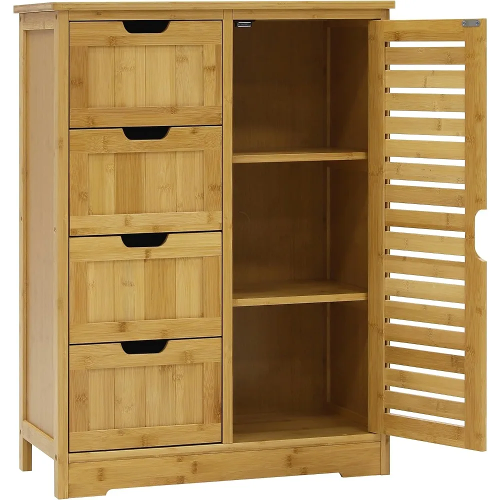 This bathroom cabinet is crafted from high-quality bamboo, offering sustainable and durable construction that lasts while minimizing environmental impact. It features a thoughtful design with two removable shelves and four spacious drawers, providing ample space for organizing various toiletries and bathroom essentials efficiently. The aesthetic appeal of the cabinet is enhanced by its hollow-carved door and cut-out handles, creating a stylish addition to your bathroom décor. The freestanding design is equipped with a magnetic door stop, allowing for easy access while keeping items securely stored and preventing the doors from swinging closed unexpectedly. The overall size of the cabinet is 23.7 inches wide, 11.9 inches deep, and 32.5 inches high. The drawer size is 10.3 inches wide, 9.6 inches deep, and 5 inches high. The countertop can support up to 80lbs, the shelves can hold 50lbs, and each drawer can bear a weight of 45lbs.