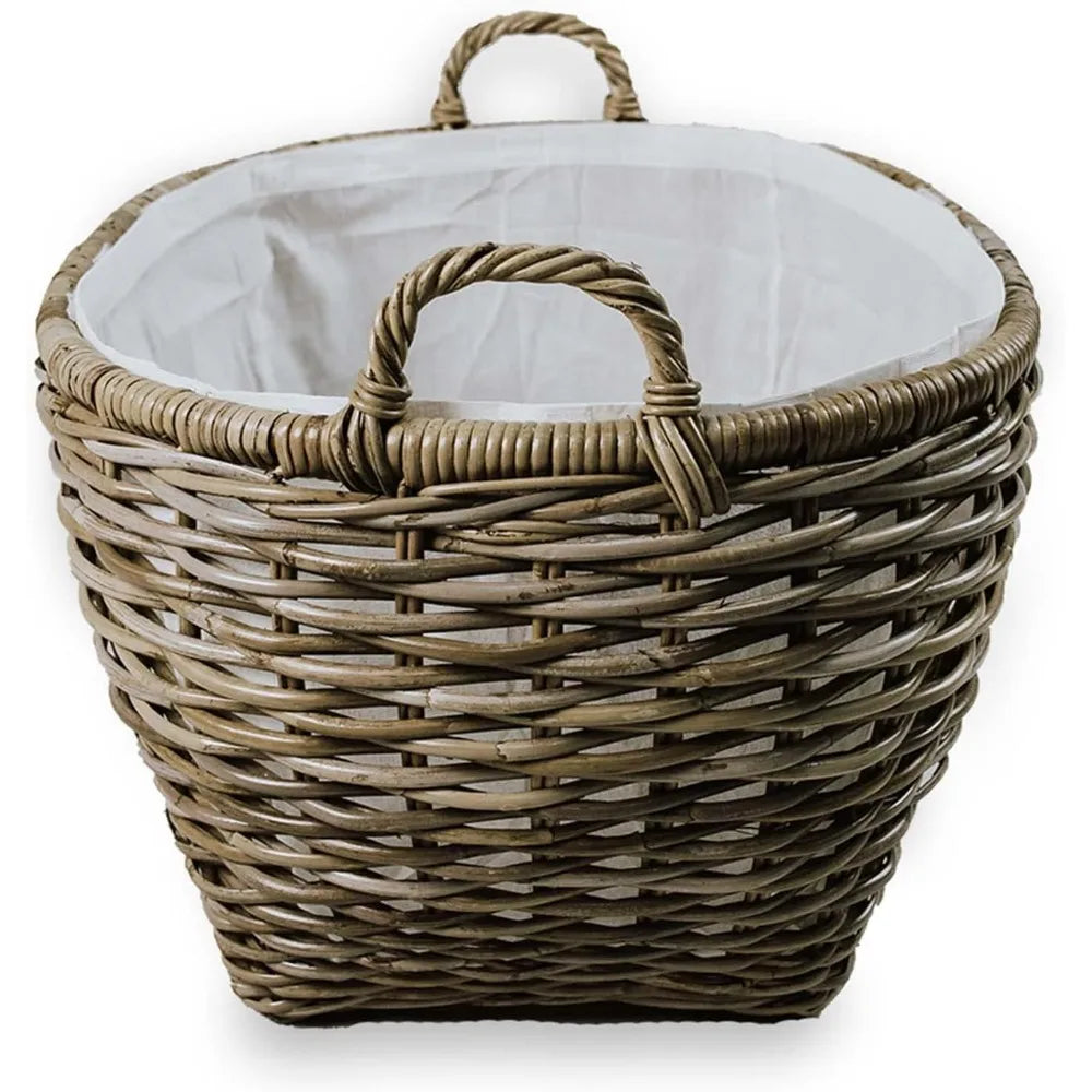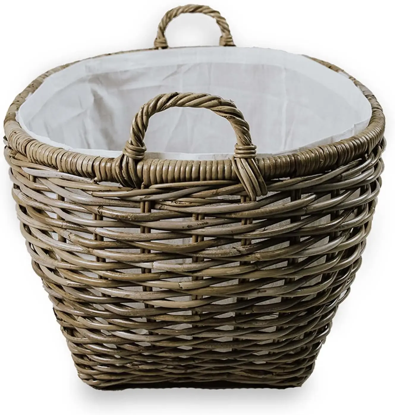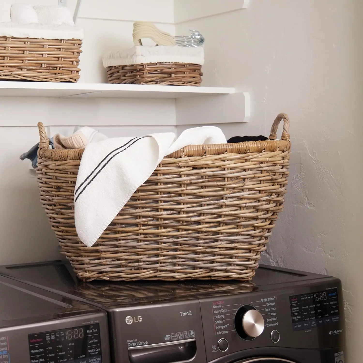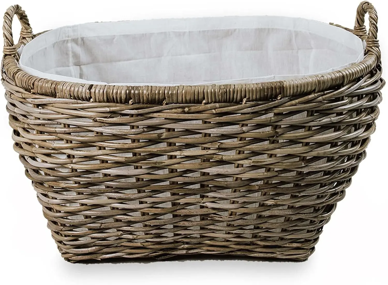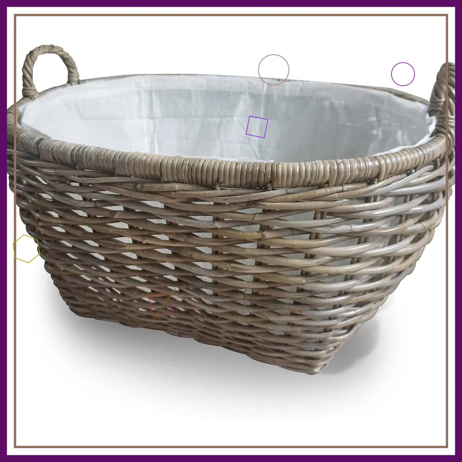 Enhance your home organization with this elegant oval wicker laundry basket, designed for both style and functionality. Measuring 25 inches in length, 19 inches in width, and 14 inches in height (without handle), it offers ample space for daily laundry needs while maintaining a compact footprint that fits easily in bedrooms, bathrooms, or closets. The serene grey color adds a calming touch to any decor. Crafted from natural kubu rattan by skilled artisans using traditional handweaving techniques, each basket is unique with slight variations in size and color that highlight its artisanal quality. The sturdy construction ensures durability for long-term use. Key features include easy-to-carry ear handles for convenient transport around the house and a removable fabric liner with hook-and-loop closure tabs. This liner not only protects clothes from snags but can also be machine-washed for easy maintenance. The basket's classic curves provide a timeless aesthetic that coordinates well with other storage solutions. Ideal for storing laundry, blankets, toys, or as a decorative accent piece. Its versatile design makes it perfect for homes seeking an eco-friendly and stylish storage option.