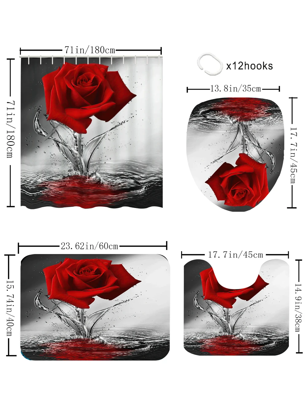 Red Rose Bathroom Four-piece Set - Avant-garde Waterproof Shower Curtain, creating a complete bathroom kit