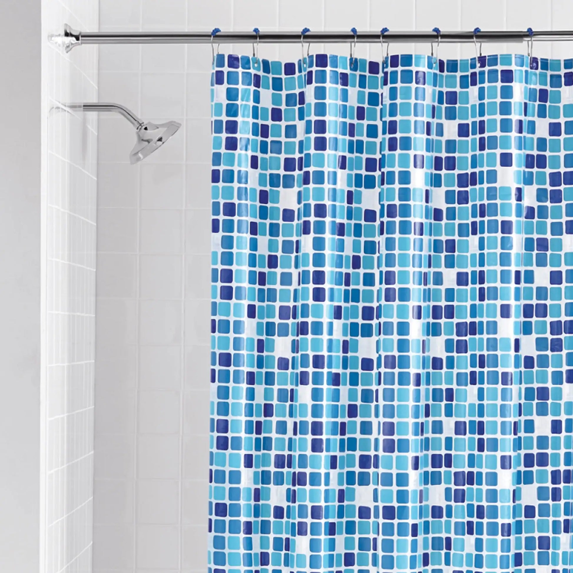Perfect for your bathroom décor with this 13-piece PEVA Mosaic Shower Curtain Set (with roller hooks). This 13-piece PEVA shower curtain set includes one 100% PEVA shower curtain and 12 roller hooks. This odorless, waterproof shower curtain features an embossed tile pattern that adds dimension and style to any bathroom. The curtain hangs easily on the curtain rod and is securely designed to stay in place. Cleaning is also a breeze – simply wipe with a damp cloth. This PEVA shower curtain measures 70 inches x 72 inches and fits most standard-sized showers/bathtubs.